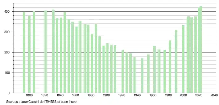 L'évolution du nombre d'habitants est connue à travers les recensements de la population effectués dans la commune depuis 1793. Pour les communes de moins de 10 000 habitants, une enquête de recensement portant sur toute la population est réalisée tous les cinq ans, les populations de référence des années intermédiaires étant quant à elles estimées par interpolation ou extrapolation[20]. Pour la commune, le premier recensement exhaustif entrant dans le cadre du nouveau dispositif a été réalisé en 2005[21].