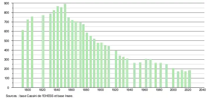 L'évolution du nombre d'habitants est connue à travers les recensements de la population effectués dans la commune depuis 1793. Pour les communes de moins de 10 000 habitants, une enquête de recensement portant sur toute la population est réalisée tous les cinq ans, les populations de référence des années intermédiaires étant quant à elles estimées par interpolation ou extrapolation[19]. Pour la commune, le premier recensement exhaustif entrant dans le cadre du nouveau dispositif a été réalisé en 2006[20].