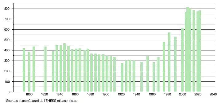 L'évolution du nombre d'habitants est connue à travers les recensements de la population effectués dans la commune depuis 1793. Pour les communes de moins de 10 000 habitants, une enquête de recensement portant sur toute la population est réalisée tous les cinq ans, les populations de référence des années intermédiaires étant quant à elles estimées par interpolation ou extrapolation[34]. Pour la commune, le premier recensement exhaustif entrant dans le cadre du nouveau dispositif a été réalisé en 2004[35].