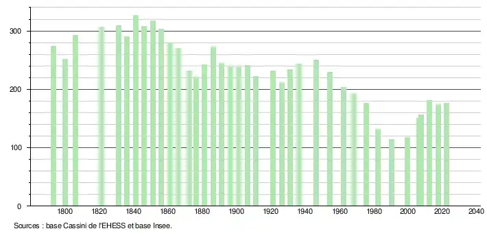 L'évolution du nombre d'habitants est connue à travers les recensements de la population effectués dans la commune depuis 1793. Pour les communes de moins de 10 000 habitants, une enquête de recensement portant sur toute la population est réalisée tous les cinq ans, les populations de référence des années intermédiaires étant quant à elles estimées par interpolation ou extrapolation[23]. Pour la commune, le premier recensement exhaustif entrant dans le cadre du nouveau dispositif a été réalisé en 2007[24].