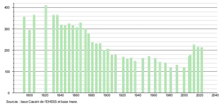 L'évolution du nombre d'habitants est connue à travers les recensements de la population effectués dans la commune depuis 1793. Pour les communes de moins de 10 000 habitants, une enquête de recensement portant sur toute la population est réalisée tous les cinq ans, les populations de référence des années intermédiaires étant quant à elles estimées par interpolation ou extrapolation[21]. Pour la commune, le premier recensement exhaustif entrant dans le cadre du nouveau dispositif a été réalisé en 2007[22].