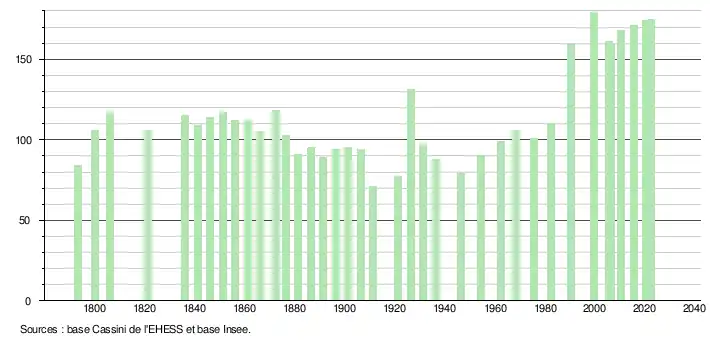 L'évolution du nombre d'habitants est connue à travers les recensements de la population effectués dans la commune depuis 1793. Pour les communes de moins de 10 000 habitants, une enquête de recensement portant sur toute la population est réalisée tous les cinq ans, les populations de référence des années intermédiaires étant quant à elles estimées par interpolation ou extrapolation[26]. Pour la commune, le premier recensement exhaustif entrant dans le cadre du nouveau dispositif a été réalisé en 2005[27].