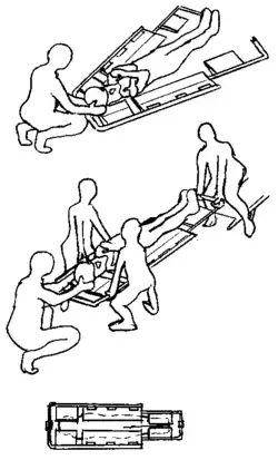 Ce dispositif permet de faire un relevage avec seulement deux sauveteurs, un tenant la civière à la tête, l'autre aux pieds.