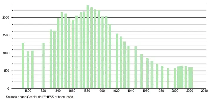 L'évolution du nombre d'habitants est connue à travers les recensements de la population effectués dans la commune depuis 1793. Pour les communes de moins de 10 000 habitants, une enquête de recensement portant sur toute la population est réalisée tous les cinq ans, les populations de référence des années intermédiaires étant quant à elles estimées par interpolation ou extrapolation[13]. Pour la commune, le premier recensement exhaustif entrant dans le cadre du nouveau dispositif a été réalisé en 2004[14].