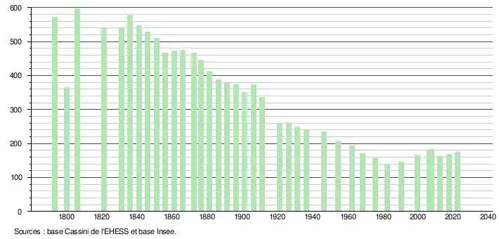 L'évolution du nombre d'habitants est connue à travers les recensements de la population effectués dans la commune depuis 1793. Pour les communes de moins de 10 000 habitants, une enquête de recensement portant sur toute la population est réalisée tous les cinq ans, les populations de référence des années intermédiaires étant quant à elles estimées par interpolation ou extrapolation[14]. Pour la commune, le premier recensement exhaustif entrant dans le cadre du nouveau dispositif a été réalisé en 2007[15].