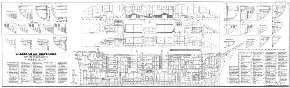 - ↑ Bien que celui-ci comportât une bouche à feu supplémentaire, la Bretagne le surpassait tant par ses dimensions et son déplacement que par sa vitesse et le poids de sa bordée