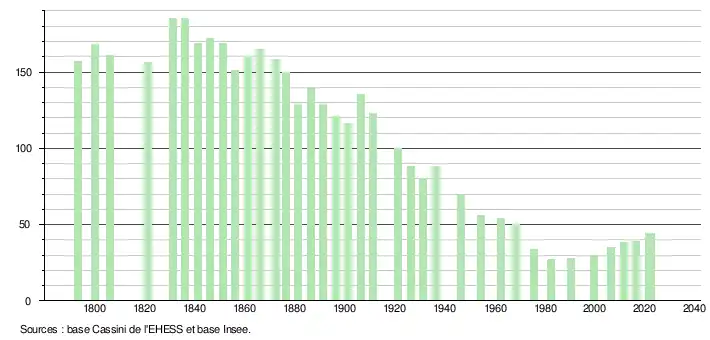 L'évolution du nombre d'habitants est connue à travers les recensements de la population effectués dans la commune depuis 1793. Pour les communes de moins de 10 000 habitants, une enquête de recensement portant sur toute la population est réalisée tous les cinq ans, les populations de référence des années intermédiaires étant quant à elles estimées par interpolation ou extrapolation[14]. Pour la commune, le premier recensement exhaustif entrant dans le cadre du nouveau dispositif a été réalisé en 2006[15].