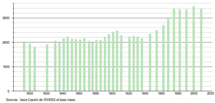 L'évolution du nombre d'habitants est connue à travers les recensements de la population effectués dans la commune depuis 1793. À partir du , les populations légales des communes sont publiées annuellement dans le cadre d'un recensement qui repose désormais sur une collecte d'information annuelle, concernant successivement tous les territoires communaux au cours d'une période de cinq ans. Pour les communes de moins de 10 000 habitants, une enquête de recensement portant sur toute la population est réalisée tous les cinq ans, les populations légales des années intermédiaires étant quant à elles estimées par interpolation ou extrapolation[9]. Pour la commune, le premier recensement exhaustif entrant dans le cadre du nouveau dispositif a été réalisé en 2008[10],[Note 1].