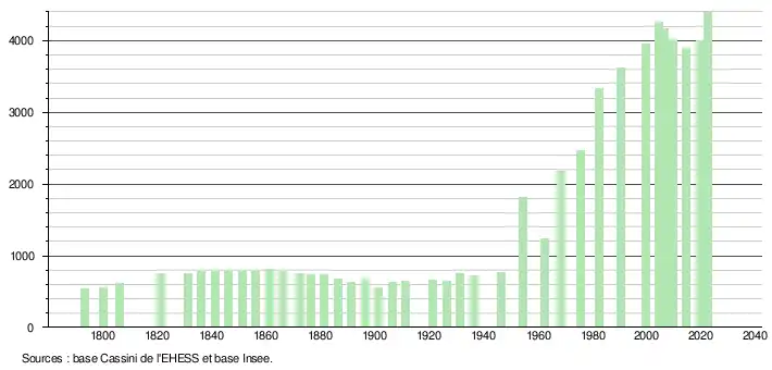 L'évolution du nombre d'habitants est connue à travers les recensements de la population effectués dans la commune depuis 1793. Pour les communes de moins de 10 000 habitants, une enquête de recensement portant sur toute la population est réalisée tous les cinq ans, les populations de référence des années intermédiaires étant quant à elles estimées par interpolation ou extrapolation[29]. Pour la commune, le premier recensement exhaustif entrant dans le cadre du nouveau dispositif a été réalisé en 2004[30].