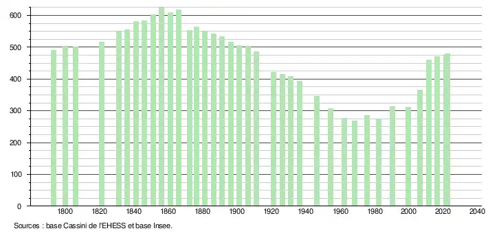 L'évolution du nombre d'habitants est connue à travers les recensements de la population effectués dans la commune depuis 1793. Pour les communes de moins de 10 000 habitants, une enquête de recensement portant sur toute la population est réalisée tous les cinq ans, les populations de référence des années intermédiaires étant quant à elles estimées par interpolation ou extrapolation[21]. Pour la commune, le premier recensement exhaustif entrant dans le cadre du nouveau dispositif a été réalisé en 2006[22].