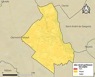 Le retrait-gonflement des sols argileux est susceptible d'engendrer des dommages importants aux bâtiments en cas d’alternance de périodes de sécheresse et de pluie. La totalité de la commune est en aléa moyen ou fort (59,3 % au niveau départemental et 48,5 % au niveau national). Sur les 339 bâtiments dénombrés sur la commune en 2019, 339 sont en aléa moyen ou fort, soit 100 %, à comparer aux 85 % au niveau départemental et 54 % au niveau national. Une cartographie de l'exposition du territoire national au retrait gonflement des sols argileux est disponible sur le site du BRGM[15],[Carte 2].