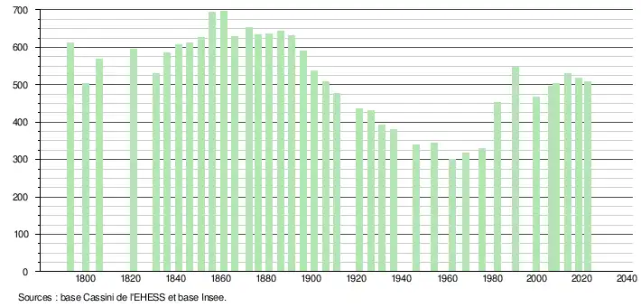 L'évolution du nombre d'habitants est connue à travers les recensements de la population effectués dans la commune depuis 1793. Pour les communes de moins de 10 000 habitants, une enquête de recensement portant sur toute la population est réalisée tous les cinq ans, les populations de référence des années intermédiaires étant quant à elles estimées par interpolation ou extrapolation[19]. Pour la commune, le premier recensement exhaustif entrant dans le cadre du nouveau dispositif a été réalisé en 2008[20].