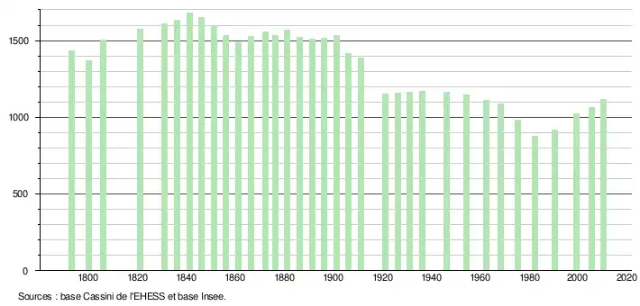L'évolution du nombre d'habitants est connue à travers les recensements de la population effectués dans la commune depuis 1793. À partir du , les populations légales des communes sont publiées annuellement dans le cadre d'un recensement qui repose désormais sur une collecte d'information annuelle, concernant successivement tous les territoires communaux au cours d'une période de cinq ans. Pour les communes de moins de 10 000 habitants, une enquête de recensement portant sur toute la population est réalisée tous les cinq ans, les populations légales des années intermédiaires étant quant à elles estimées par interpolation ou extrapolation[11]. Pour la commune, le premier recensement exhaustif entrant dans le cadre du nouveau dispositif a été réalisé en 2005[12],[Note 1].