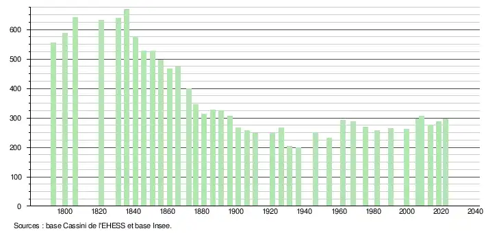 L'évolution du nombre d'habitants est connue à travers les recensements de la population effectués dans la commune depuis 1793. Pour les communes de moins de 10 000 habitants, une enquête de recensement portant sur toute la population est réalisée tous les cinq ans, les populations de référence des années intermédiaires étant quant à elles estimées par interpolation ou extrapolation[24]. Pour la commune, le premier recensement exhaustif entrant dans le cadre du nouveau dispositif a été réalisé en 2008[25].