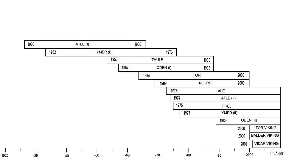 En 1989, Oden (II) est livré par les chantiers navals d'Arendal à Göteborg pour remplacer Thule et Oden (I). Enfin, au début des années 2000, les trois brise-glace de la classe Viking sont livrés par le norvégien Havyard Leirvik pour remplacer Tor et Njord.