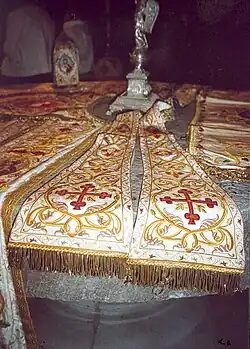 Il existait des fils de différents calibres et de matières variées. Néanmoins, dans les années 1880, une brodeuse d'un grand talent, Anna Poirot[32] qui brodait des ornements d'église, se servait de ses propres cheveux[33],[34] comme fil à broder pour réaliser les cheveux des anges sur ses décors[30].