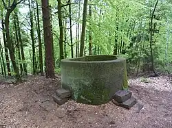 À la pointe sud du plateau inférieur se trouve une grande cuve circulaire de trois mètres de diamètre pour deux mètres de haut, taillée dans le grès. La datation et la raison d'être de cette cuve ne sont pas claires, mais elle aurait pu servir à collecter l'eau de la source qui se trouvait de ce côté[5].