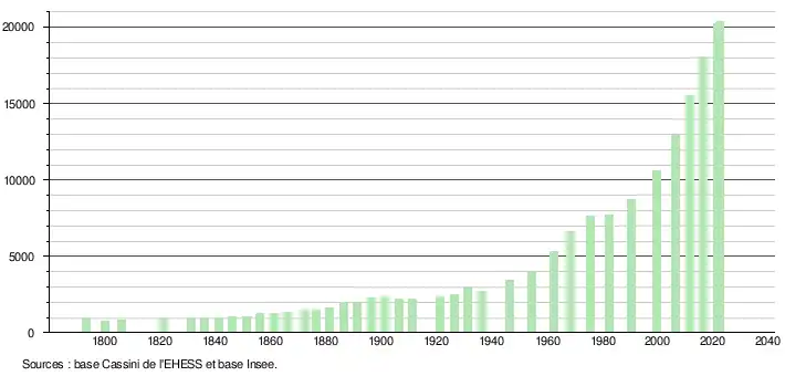 - ↑ Par convention dans Wikipédia, le principe a été retenu de n’afficher dans le tableau des recensements et le graphique, pour les populations de référence postérieures à 1999, que les populations correspondant à une enquête exhaustive de recensement pour les communes de moins de 10 000 habitants, et que les populations des années 2006, 2011, 2016, etc. pour les communes de plus de 10 000 habitants, ainsi que la dernière population de référence publiée par l’Insee pour l'ensemble des communes.