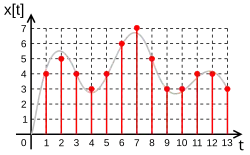 et est la fréquence à laquelle sont prélevés les échantillons (autrement dit : ceux-ci sont régulièrement espacés dans le temps[1]) du signal, ce qui correspond à la multiplication du signal par un peigne de fonctions delta de Dirac, et induit l'effet de repliement du spectre des signaux échantillonnés. En théorie, on considère qu'on travaille avec un spectre limité à la demi-fréquence d'échantillonnage de façon à éviter les conséquences néfastes de ce repliement. En pratique, c'est cependant impossible, car tout signal dont la durée est limitée dans le temps, a nécessairement une extension fréquentielle infinie, néanmoins, on peut considérer que c'est négligeable.