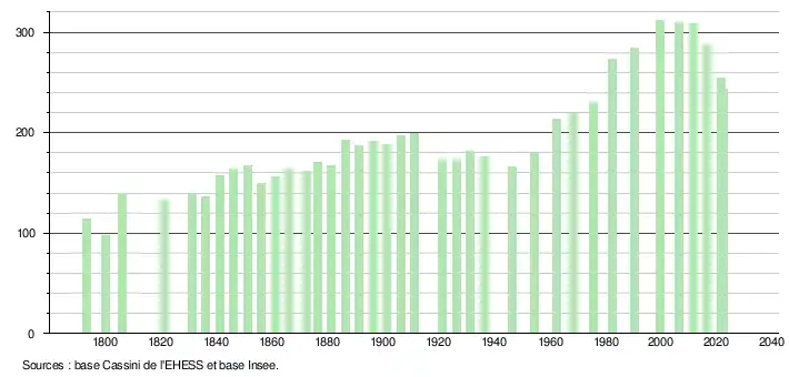 L'évolution du nombre d'habitants est connue à travers les recensements de la population effectués dans la commune depuis 1793. Pour les communes de moins de 10 000 habitants, une enquête de recensement portant sur toute la population est réalisée tous les cinq ans, les populations de référence des années intermédiaires étant quant à elles estimées par interpolation ou extrapolation[14]. Pour la commune, le premier recensement exhaustif entrant dans le cadre du nouveau dispositif a été réalisé en 2006[15].