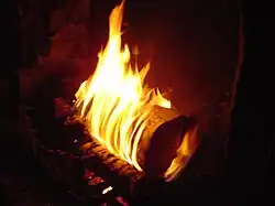 Depuis plusieurs siècles, en effet, on a pour habitude, lors de la veillée de Noël, de faire brûler dans l'âtre une très grosse bûche[2],[3] qui doit se consumer très lentement, l'idéal étant qu'elle puisse durer pendant les douze jours du cycle (jusqu'au nouvel an) ou au moins pendant trois jours. La bûche doit provenir, de préférence, d'un tronc d'arbre fruitier dans le sud (prunier, cerisier et olivier) censé garantir une bonne récolte pour l'année suivante, mais aussi chêne et hêtre dans le nord puisque les glands comme les faînes étaient une nourriture pour les hommes jusqu'à la fin du Moyen Âge[4]. Lors de l'allumage, la bûche est bénie à l'aide d'une branche de buis, ou de laurier, conservée depuis la fête des Rameaux. Lors de sa combustion, la bûche est, dans certaines régions, arrosée de vin afin d'assurer une bonne vendange, ou de sel pour se protéger des sorcières. On conserve souvent ses tisons afin de préserver la maison de la foudre ou du diable[5] et les cendres sont répandues dans les champs pour fertiliser la terre. On conservait aussi toute l'année du charbon qu'on faisait entrer dans la composition de plusieurs remèdes. Allumée avec des tisons de la précédente bûche de Noël ou de la Saint-Jean passée, ses cendres servaient de protection (et autres croyances populaires) à toute la maisonnée jusqu’à l’année suivante[6].