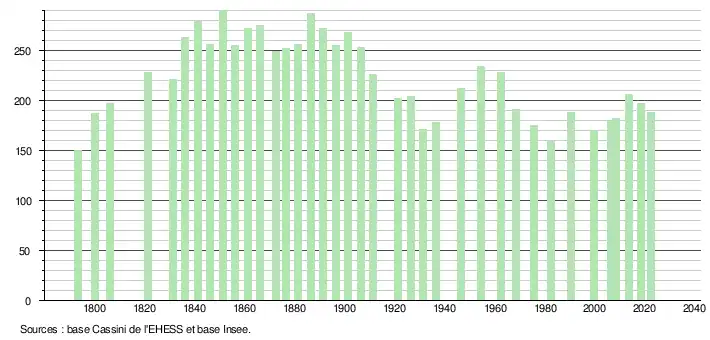L'évolution du nombre d'habitants est connue à travers les recensements de la population effectués dans la commune depuis 1793. Pour les communes de moins de 10 000 habitants, une enquête de recensement portant sur toute la population est réalisée tous les cinq ans, les populations de référence des années intermédiaires étant quant à elles estimées par interpolation ou extrapolation[25]. Pour la commune, le premier recensement exhaustif entrant dans le cadre du nouveau dispositif a été réalisé en 2008[26].