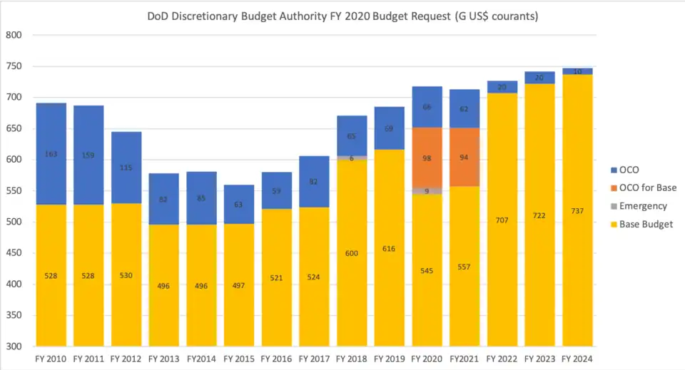 Le projet de budget du DoD pour FY 2020 est en engagement de dépenses de 728 milliards US$ dont 718 milliards US$ de dépenses discrétionnaires et 10 milliards US$ de dépenses obligatoires. Les dépenses discrétionnaires demandées sont en augmentation de 4,8 % par rapport à FY 2019 en dollars courants et de 2,8 % à prix constant[4].