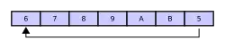 Pour finir, si deux éléments sont alors retirés, les éléments obtenus ne seraient alors pas 3 et 4 mais 5 et 6, car A et B ont écrasé le 3 et le 4 ; laissant le buffer dans cet état :