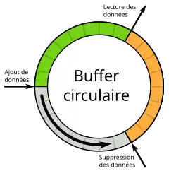 Un buffer circulaire est une structure de données utilisant un buffer de taille fixe et dont le début et la fin sont considérés comme connectés. Les buffers circulaires sont souvent utilisés pour gérer des flux de données ou pour implémenter un comportement de type FIFO.
