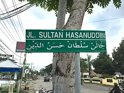 Panneau bilingue à Baubau écrit en indonésien et en wolio avec le buri wolio.