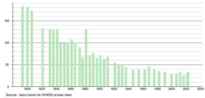 L'évolution du nombre d'habitants est connue à travers les recensements de la population effectués dans la commune depuis 1793. Pour les communes de moins de 10 000 habitants, une enquête de recensement portant sur toute la population est réalisée tous les cinq ans, les populations de référence des années intermédiaires étant quant à elles estimées par interpolation ou extrapolation[12]. Pour la commune, le premier recensement exhaustif entrant dans le cadre du nouveau dispositif a été réalisé en 2006[13].