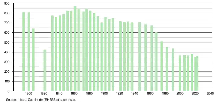 L'évolution du nombre d'habitants est connue à travers les recensements de la population effectués dans la commune depuis 1793. Pour les communes de moins de 10 000 habitants, une enquête de recensement portant sur toute la population est réalisée tous les cinq ans, les populations de référence des années intermédiaires étant quant à elles estimées par interpolation ou extrapolation[19]. Pour la commune, le premier recensement exhaustif entrant dans le cadre du nouveau dispositif a été réalisé en 2005[20].