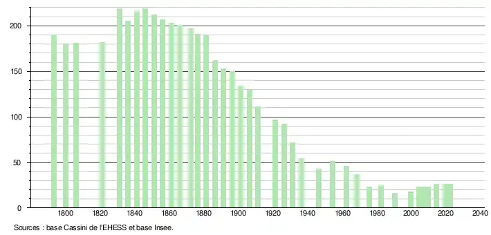 L'évolution du nombre d'habitants est connue à travers les recensements de la population effectués dans la commune depuis 1793. Pour les communes de moins de 10 000 habitants, une enquête de recensement portant sur toute la population est réalisée tous les cinq ans, les populations de référence des années intermédiaires étant quant à elles estimées par interpolation ou extrapolation[14]. Pour la commune, le premier recensement exhaustif entrant dans le cadre du nouveau dispositif a été réalisé en 2004[15].