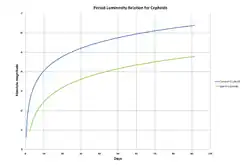 La luminosité d'une Céphéide classique est directement reliée à sa période de variation. Plus la période de pulsation est longue, plus lumineuse est l'étoile. La relation période-luminosité des Céphéides classiques fut découverte en 1908 par Henrietta Swan Leavitt dans une étude portant sur des milliers d'étoiles variables des Nuages de Magellan[20]. Elle la publia en 1912[21] avec des preuves supplémentaires. Une fois que la relation période-luminosité est calibrée, la luminosité d'une étoile donnée dont la période est connue peut être établie. Sa distance est ensuite obtenue à partir de sa luminosité apparente. La relation période-luminosité a été calibrée par de nombreux astronomes tout au long du XXe siècle, en commençant par Hertzsprung[22]. La calibration de la relation période-luminosité a été problématique ; cependant, une calibration galactique solide a été établie par Benedict et al. 2007 en utilisant les parallaxes précises de Hubble pour 10 Céphéides classiques proches[23]. De même, en 2008, des astronomes de l'ESO ont estimé avec une précision meilleure que 1 % la distance de la Céphéide RS Puppis, en utilisant les échos de lumière de la nébuleuse dans laquelle elle est plongée [24]. Cependant, ce résultat a été activement débattu dans la littérature[25].