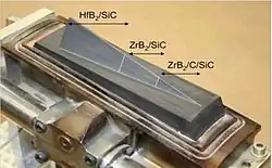 Une céramique ultraréfractaire, ou céramique ultra-haute température (UHTC), est une céramique réfractaire présentant une très bonne stabilité thermique au-delà de 2 000 °C[1]. De tels matériaux peuvent être utilisés pour les boucliers thermiques protégeant un véhicule spatial lors de sa rentrée atmosphérique, pour les revêtements de pièces soumises à des températures élevées ou comme matériau constitutif de telles pièces. D'une manière générale, les céramiques ultraréfractaires sont des borures, des carbures, des nitrures et des oxydes de métaux de transition des premiers groupes (colonnes du titane, du vanadium, du chrome, voire du manganèse). Les recherches s'intéressent notamment aux borures de métaux de transition plus lourds tels que le diborure d'hafnium HfB2 et le diborure de zirconium ZrB2[2],[3]. D'autres céramiques ultraréfractaires étudiées pour les systèmes de protection thermique lors de la rentrée atmosphérique des engins spatiaux sont par exemple le nitrure d'hafnium HfN[4], le nitrure de zirconium ZrN[5], le carbure de titane TiC[6], le nitrure de titane TiN, le dioxyde de thorium ThO2[7], le carbure de tantale TaC[8] et leurs composites associés[9].