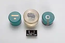 Pour faciliter la préparation ultérieure, l'échantillon scié est généralement incorporé (ou monté ou encapsulé) dans un disque en plastique, 25, 30 ou 35. mm de diamètre. Une résine solide thermodurcissable, activée par la chaleur et la compression, par exemple un époxy chargé de minéraux, convient le mieux à la plupart des applications. Une résine coulable (liquide) telle que des résines époxy, acryliques ou polyester non chargées peut être utilisée pour les céramiques réfractaires poreuses ou les dispositifs microélectroniques. Les résines coulables sont également disponibles avec des colorants fluorescents facilitant la microscopie à fluorescence. Les échantillons gauche et droit de la figure 3 ont été intégrés dans un époxy rempli de minéraux. Le réfractaire central de la figure 3 était incorporé dans de l'acrylique transparent moulable.