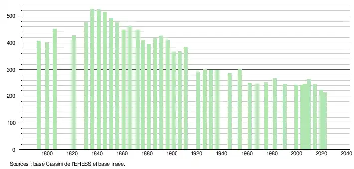 L'évolution du nombre d'habitants est connue à travers les recensements de la population effectués dans la commune depuis 1793. Pour les communes de moins de 10 000 habitants, une enquête de recensement portant sur toute la population est réalisée tous les cinq ans, les populations de référence des années intermédiaires étant quant à elles estimées par interpolation ou extrapolation[13]. Pour la commune, le premier recensement exhaustif entrant dans le cadre du nouveau dispositif a été réalisé en 2004[14].