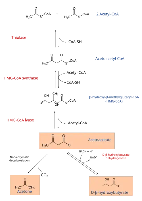 - Une troisième molécule d'acétyl-CoA est condensée sur l'acétoacétyl-CoA par HMG-CoA synthase pour donner de l'HMG-CoA. Ce composé est également un précurseur du cholestérol et des hormones stéroïdiennes, par la voie du mévalonate.