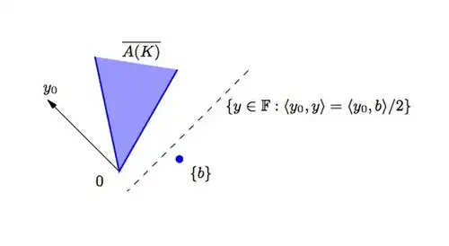 - Dans l'égalité du point 3, l'inclusion immédiate traduit le fait que est un cône convexe fermé contenant . L'inclusion réciproque, , peut s'interpréter géométriquement comme suit. Elle signifie que si un vecteur n'appartient pas à , alors , ce qui revient à dire qu'il existe un vecteur tel que , ou encore, tel qu'un certain hyperplan orthogonal à sépare strictement de . La démonstration du point 3 peut d'ailleurs se faire par séparation stricte de ces deux convexes (théorème de Hahn-Banach).