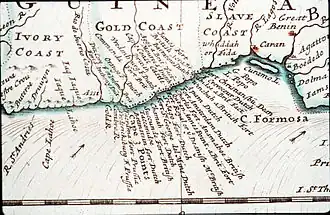 Au-delà, au contraire, sur la future "Côte des Esclaves" une longue succession de lagunes et de marécages, n'avait pas encore un seul établissement européen permanent[10]. Le fait que ces pays aient voulu rapidement concurrencer la Hollande dans la recherche d'or en Afrique et d'épices dans l’océan Indien[10] s'est ajouté à l'émergence de leurs opérations commerciales en Amérique[10], dès les années 1630 pour les Anglais et Français, la décennie suivante pour les Suédois et Danois du Brandebourg. Lorsque le Duché de Courlande a par exemple décidé de coloniser Tobago, sa compagnie a entretenu un fort en Gambie[10]. Les plupart des forts de la Côte de l'Or, mal implantés et sans préparation sérieuse, ont été abandonnés ou ont changé de propriétaire rapidement[10].