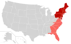 Si le terme est utilisé dans un sens strictement géographique, la côte Est contient aussi les États de la Virginie, les Carolines (du Nord et du Sud), de la Géorgie, et de la Floride. Pourtant, les derniers États sont généralement classés dans la région du Sud (ou Sud-Est) au lieu de la côte Est.