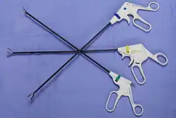 • Des trocarts (sortes de grosses aiguilles de 5 à 12 mm de diamètre) sont enfin introduits à travers la paroi ainsi soulevée, par lesquels le chirurgien va passer des instruments de 5 à 12 mm de diamètre pour opérer (pinces, ciseaux, instruments de coagulation et de suture, etc.).