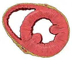 Le cœur est un muscle creux contenant deux parties séparées bien qu'accolées l'une à l'autre : le « cœur gauche » et le « cœur droit ». Ces deux « cœurs » sont situés côte-à-côte dans l'axe base-apex, séparés par une paroi globalement verticale et orientée dans l'axe du cœur. Chacune de ces deux parties est subdivisée en deux chambres ou cavités, l'atrium (ou oreillette) vers la base et le ventricule vers l'apex. Ces deux cavités sont séparées par une valve ; on distingue ainsi la valve mitrale, entre l'atrium et le ventricule gauches, et la valve tricuspide, entre l'atrium et le ventricule droits. L'organisation est symétrique entre le cœur gauche et le cœur droit, bien que le cœur gauche soit plus volumineux. Afin que le ventricule droit puisse répondre à ses contraintes de pression dilatatrice, la trabécule septo-marginale solidarise les différentes parois ventriculaires[2].