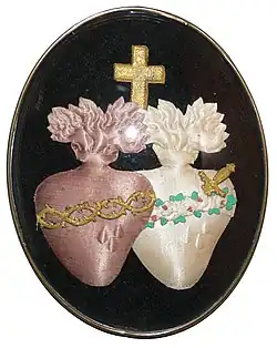 Le Cœur immaculé de Marie est souvent représenté, dans l'art chrétien, sous la forme d'un cœur enflammé brillant d'une lumière divine, symbolisant l'amour de la Vierge Marie pour Dieu et pour l'humanité. Il est généralement entouré de roses et parfois surmonté d'une fleur de lys, symbolisant sa pureté, comme définie par le dogme de l'Immaculée conception par l'Église catholique. Son cœur est percé d'un glaive, représentant la prophétie de Siméon dans l'Évangile selon Luc à son propos et les souffrances qu'elle a connu au cours de sa vie (voir Notre-Dame des Douleurs)[21].