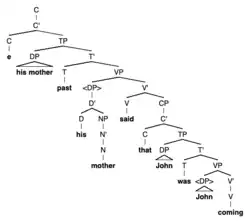 Dans la phrase 1, "he" ne peut pas se référer à "John". En effet, "he" c-commande "John" dans l'arbre syntaxique de la phrase 1. Dans la phrase 2, "his" et "John" peuvent être co-référents, le pronom "his" ne c-commande pas la R-expression "John". Dans l'arbre de la phrase 2, "his" et la NP (Noun pronom) qui domine "mother" sont sœurs mais NP ne domine pas "John". Le pronom est ainsi libre dans son domaine. La c-commande selon le principe A peut être présentée par l'exemple :