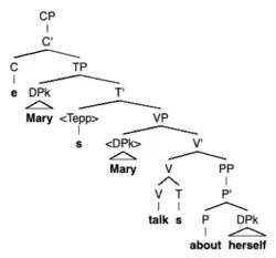 L'anaphore "herself" obéit au principe A et doit être liée dans son domaine. "herself" doit donc être co-référencé avec un antécédent [Mary] et c-commandé par l'antécédent : ainsi, la sœur de "Mary" doit dominer "herself". Le principe C est également montré par l'arbre de la phrase 3 : la R-expression Mary n'est c-commandée par aucun antécédent DP.