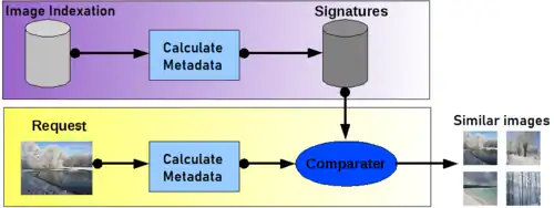 Le principe général de la recherche d'image par le contenu (de l'image) comporte deux étapes. Lors d'une première phase hors ligne (étape d'indexation), on calcule les signatures des images et on les stocke dans une base de données. La seconde phase, dite de recherche se déroule en ligne. L'utilisateur soumet une image comme requête. Le système calcule la signature selon le même mode que lors de la première phase d'indexation. Ainsi, cette signature est comparée à l'ensemble des signatures préalablement stockées pour en ramener les images les plus semblables à la requête.