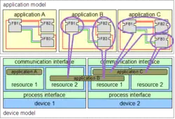 CEI 61499 permet une conception orientée sur l’application, dans laquelle une ou plusieurs applications, définies par des réseaux de blocs fonction interconnectés, sont créées pour l'ensemble du système et ensuite distribuées aux équipements disponibles. Tous les périphériques d'un système sont décrits dans un modèle de périphérique. La topologie du système est reflétée par le modèle du système. La distribution d'une application est décrite dans le modèle de cartographie. Par conséquent, les applications d'un système sont distribuables mais maintenues ensemble.