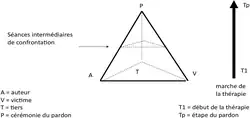 En ce sens, les stratégies de confrontation, de reconnaissance, de réparation et de pardon sont particulièrement prises en compte dans le modèle CIMI. Cette approche se fait avec toute la prudence et l’exigence requises, par étapes successives, selon un plan structuré de type « pyramidal », comme le montre la figure ci-après[10]