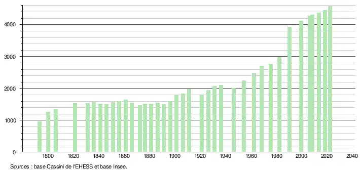 L'évolution du nombre d'habitants est connue à travers les recensements de la population effectués dans la commune depuis 1793. Pour les communes de moins de 10000habitants, une enquête de recensement portant sur toute la population est réalisée tous les cinqans, les populations de référence des années intermédiaires étant quant à elles estimées par interpolation ou extrapolation[20]. Pour la commune, le premier recensement exhaustif entrant dans le cadre du nouveau dispositif a été réalisé en 2008[21].